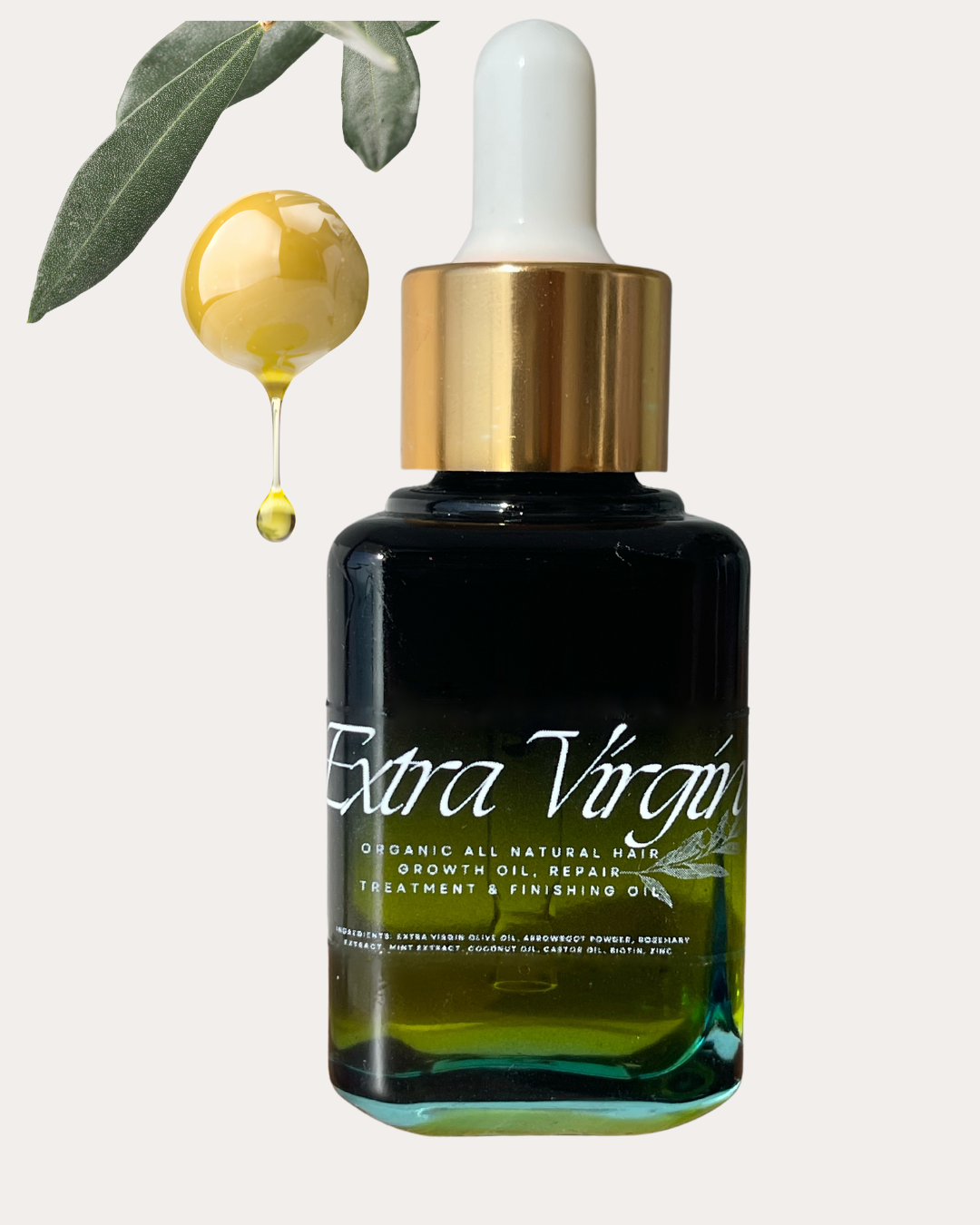 Introducing "Extra Virgin" Hair Oil: A powerhouse blend of organic oils including Extra Virgin Olive, Castor, Mint, Rosemary, and Coconut, fortified with Arrowroot Powder, Biotin, and Zinc. Combat hair loss naturally and enjoy stronger, revitalized locks with every drop.